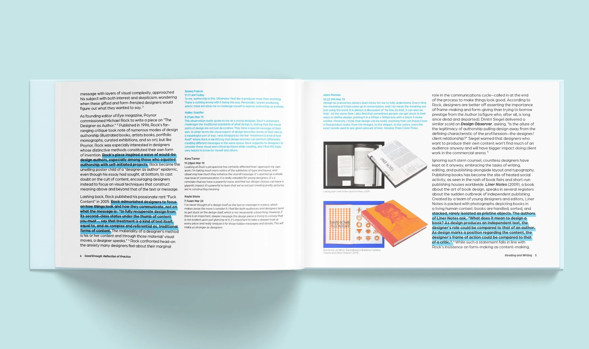 Good Enough: Reflection of Practice is a collaborative book designed and typeset in collaboration with my peers. This book contains various sections, defined by footnotes, that are meant to inform the reader through different methodologies. Content within ranges from interviews with students to informative articles accompanied by annotation.